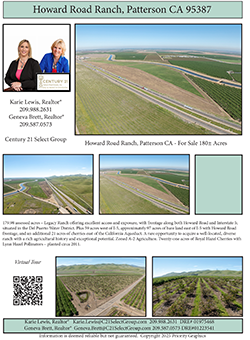 Replace existing description with:179.98 assessed acres – Legacy Ranch offering excellent access and exposure, with frontage along both Howard Road and Interstate 5; situated in the Del Puerto Water District. Plus 59 acres west of I-5, approximately 97 acres of bare land east of I-5 with Howard Road frontage, and an additional 21 acres of cherries east of the California Aqueduct. A rare opportunity to acquire a well-located, diverse ranch with a rich agricultural history and exceptional potential. Zoned A-2 Agriculture. Twenty-one acres of Royal Hazel Cherries with Lynn Hazel Pollinators – planted circa 2011.