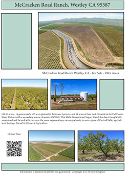 198.61 acres – Approximately 107 acres planted in Patterson Apricots, and 90 acres of bare land. Situated in the Del Puerto Water District with a secondary source of water (AG Well). This Multi-Generational Legacy Ranch has been thoughtfully maintained and farmed with care over the years, representing a rare opportunity to own a piece of Central Valley agricultural heritage. Zoned A-2 General Agriculture.